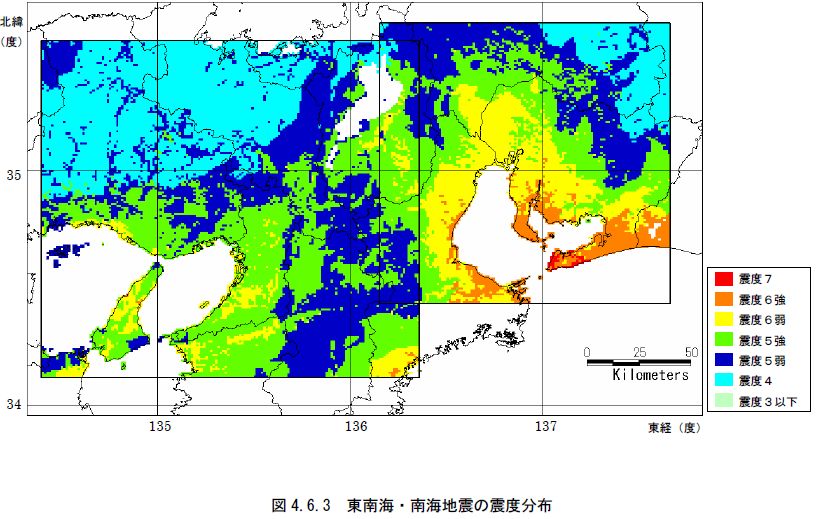 画像は、南海・東南海地震の際の予測震度分布ですが、