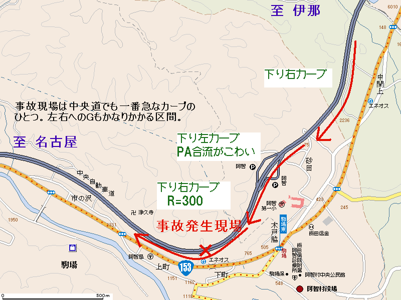 現場は飯田インターチェンジ(IC)-園原IC間にある阿智パーキングエリアから約500メートル離れた下り坂の右カーブ。